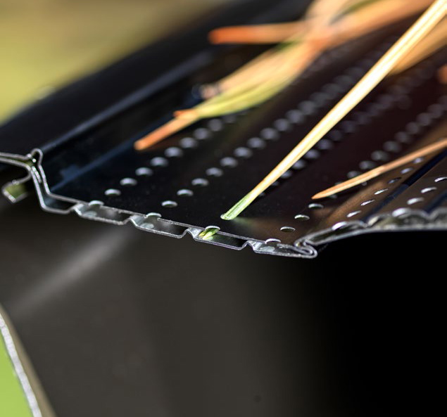 Une combinaison parfaite de deux membranes en aluminium perforé : la couche inférieure avec de grandes ouvertures oblongues, et la couche supérieure intègre des microperforations décalées avec précision pour former un filtre parfait d’une efficacité optimale.